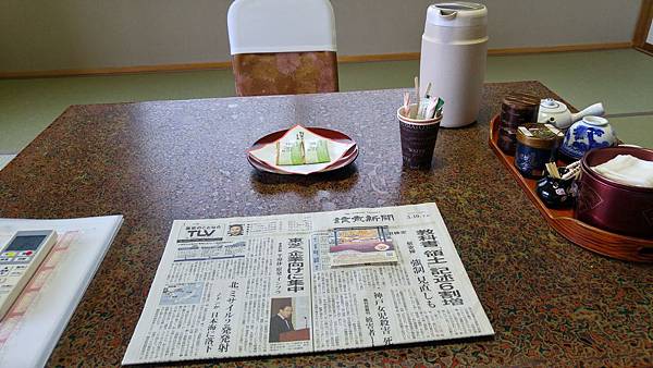 桌上放了一份讀賣新聞﹑和果子跟茶,除了一般的綠茶之外還有昆布茶。昆布茶是一片一片的,一杯大概放3~4片,味道鹹鹹的。