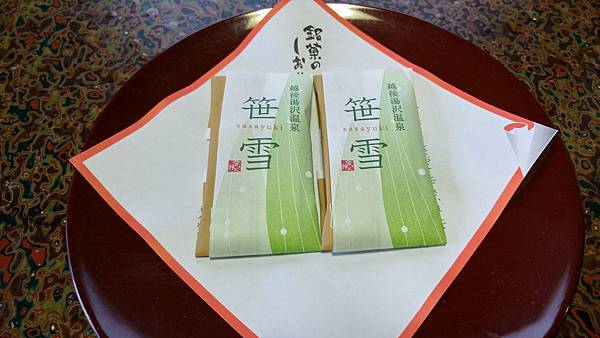 這和果子的外層像麻糬,是用這裡的特產「笹雪」葉來做的,有葉子獨特的清香,裡面包的是紅豆泥。味道沒有像一般的和果子這麼甜,大概是怕蓋掉了葉子的香味,很好吃。大堂的土產店有賣,喜歡的話可以帶回去當伴手禮。