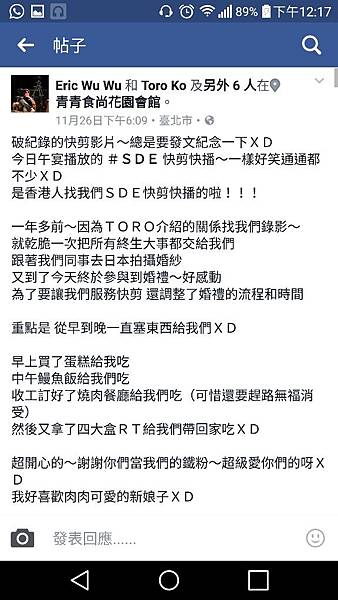 會遇到這可愛又白目的團隊,是因為看了“非常婚禮”的一篇介紹文,那段晚宴SDE快剪一看就愛上了。前面是感動的拜別場面,後面就一整個大翻身笑到瘋掉!這對我來說感覺很新鮮,因為之前搜尋一大堆SDE都只是走感動路線配著背景音樂有點單調。而且~而且! 他們是全台唯一在SDE會加字幕跟特效,這對婚禮影片很重要!就好像把一池靜水激起漣漪那樣,不止補足了場地音響的不完美(聽不清楚還可以看字),還讓笑果更好~事實上也因為導演吳小艾本身就很愛不計形象的搞笑,所以他的剪接真得好像變魔術一樣,把單純的紀錄影片變活了,現場觀眾都笑倒一片。