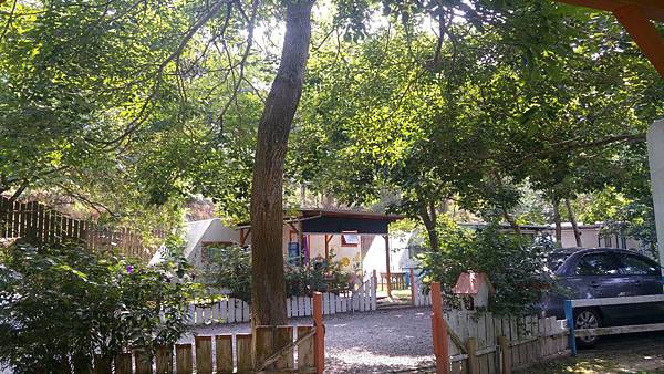怕熱如我的人,為了暑假要溜小孩就訂了露營車,起碼有冷氣吹我就比較不會上火。露營車只有12台,這邊自成一國不開放參觀,所以環境蠻安靜的。從自己的小庭園看出去都是林蔭,車子可以停在自家的門口。