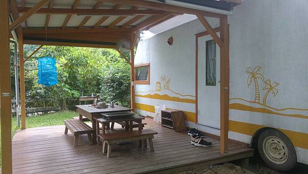 我們住的是3號車,戶外庭園自家有烤肉架、瓦斯爐超燒水壺,晚餐跟早餐都會在這用餐。後面是洗手台,旁邊有放清潔劑,可以在這洗碗盤。吊著的漁籠裝著露營用的碗盤、筷子和杯子。