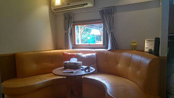 打開大門就看到小客廳,第一眼就看到我夏天最愛的冷氣! 小小的空間坐3個人剛好,4個人就有點擠。晚上大家在這看看電視,吃吃泡麵也蠻開心的,唯一的缺點這台車的冷氣有漏水的狀況吧。