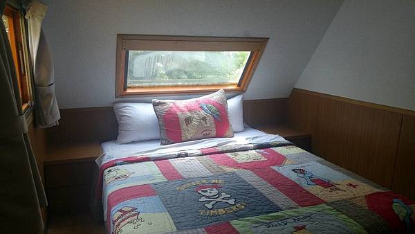 客廳的左邊是主臥房,裡面一張小雙人床,佈置很簡單就只有床跟床頭櫃。頭上那扇天窗是關不起來的,還好郊外光害不嚴重而且面裡頭對著一排大樹,不然真的會睡不著。