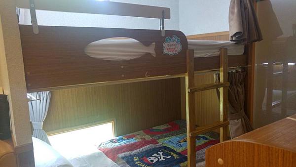 客廳的右邊是上下鋪,每張床都有小燈跟布簾,可以分隔成自己的小天地。面對著的就是小冰箱和衣櫃。小冰箱裡面每人有一瓶水和舒跑,還有一些茶包、即溶咖啡跟小餅乾。衣櫃裡面放了毛巾、浴巾、盥洗用品。基本上除了室外拖鞋之外,甚麼都不用帶就可以來住了。