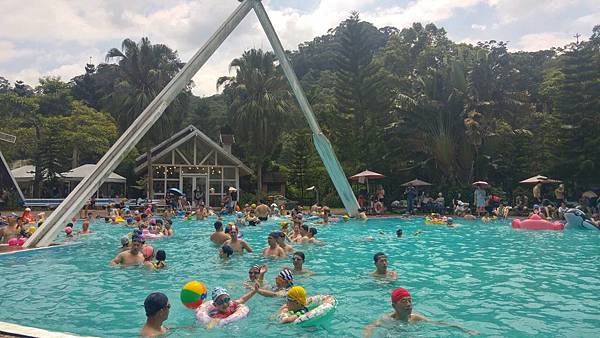 露營車園區的對面就是遊樂區,裡面有個大游泳池、餐廳和烤肉區。因為遊樂區也對外開放,那天是禮拜日超級多人來玩水,基本上也游不了泳只可以泡水。園區也只有廁所讓外來的人換衣服,在使用率超高的狀態下,清潔情況不理想。