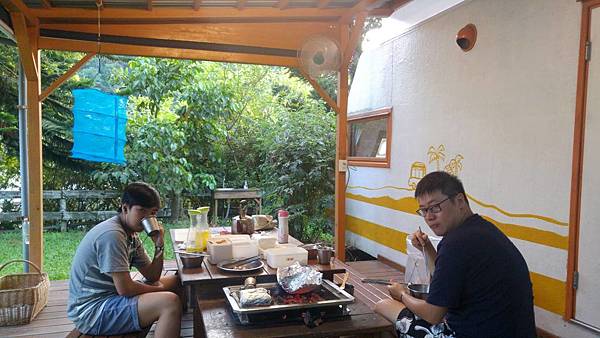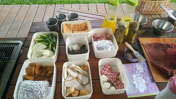 我們選的晚餐是BBQ,大概6點左右工作人員就送來餐盒和兩瓶飲料了(那天是檸檬和百香果)。除了幫忙生火之外,也非常詳細的講解各種食材的燒烤方式和要注意的地方。食材也蠻多的,大概說一下有: 牛肉、雞排、豬排、蝦子、墨魚、培根、花枝丸、金針菇、絲瓜蛤蜊、吐司、洋蔥、四季豆等等,最後我們太撐了都吃不完。